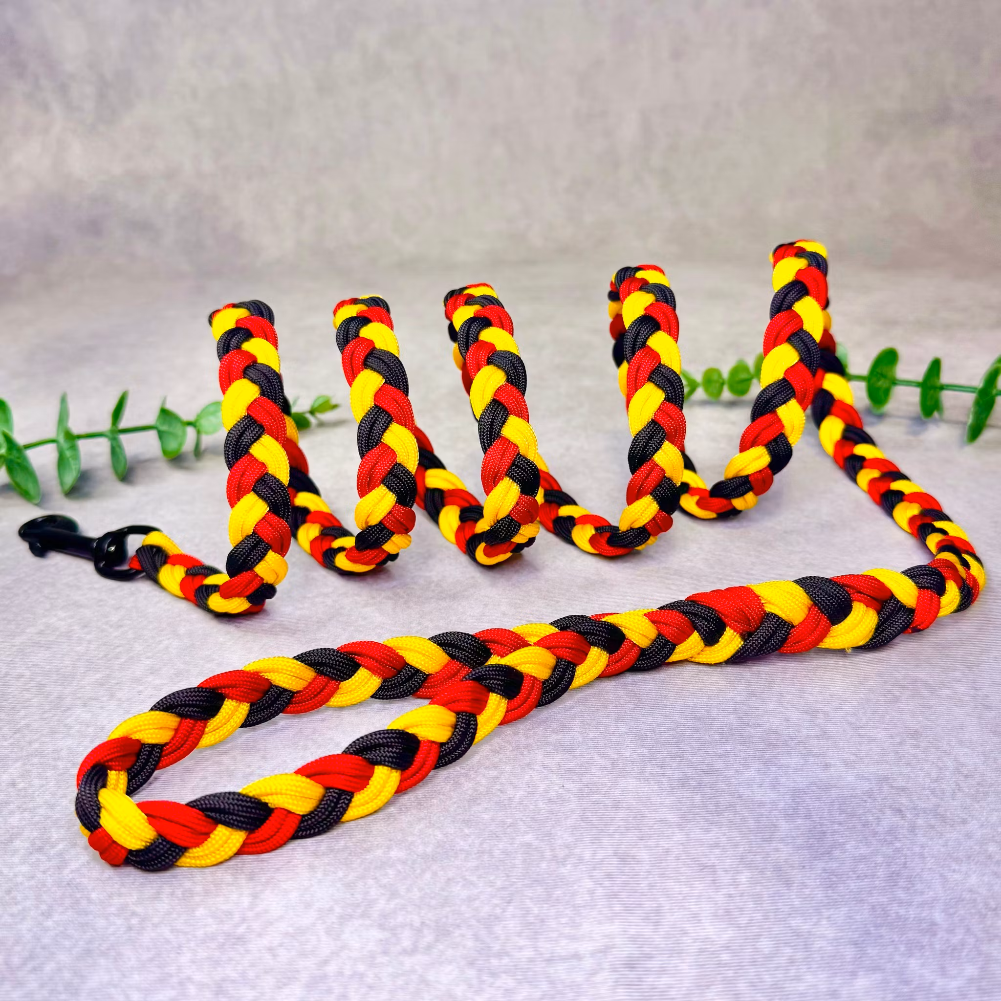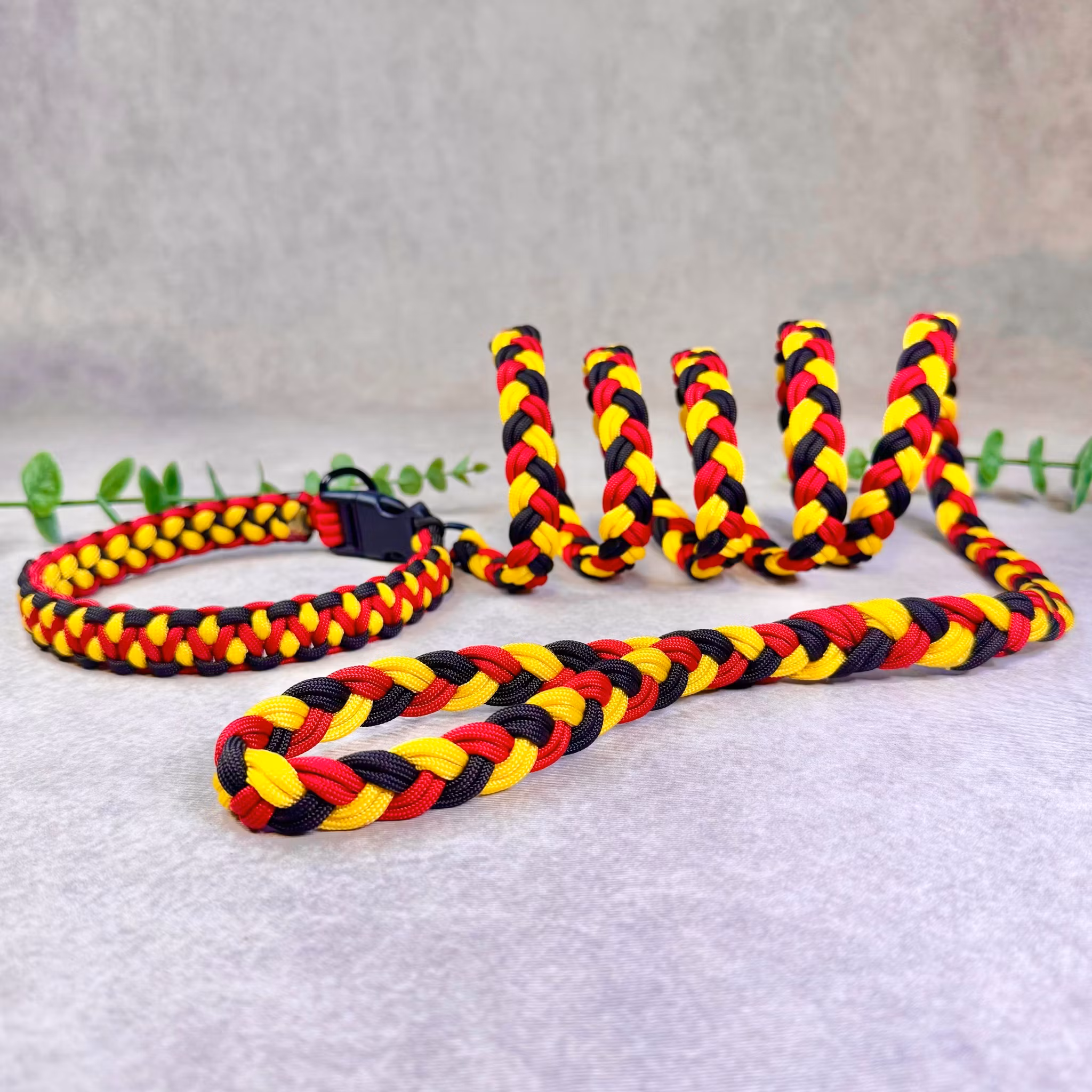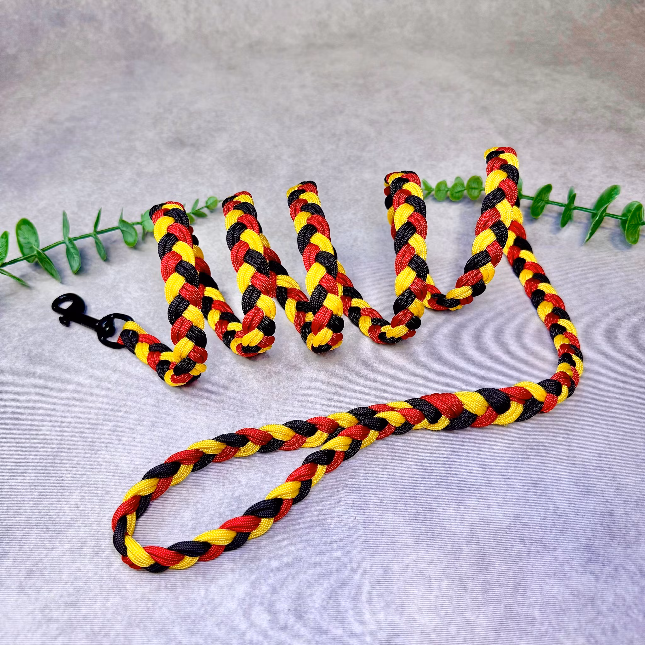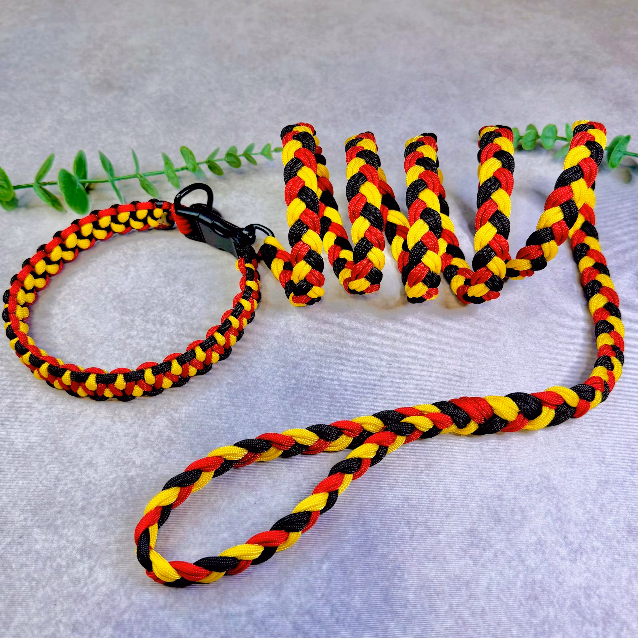 Detta handgjorda koppel i rött, gult och svart är flätat i klubbens färger och passar perfekt för den sportiga hundägaren.