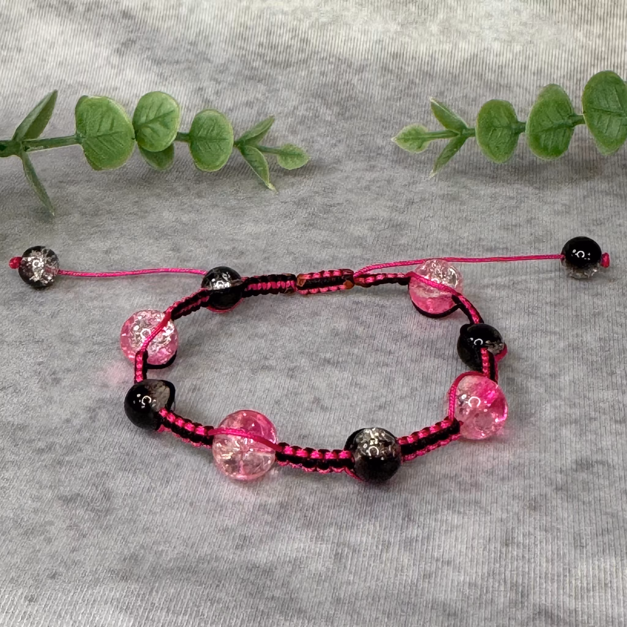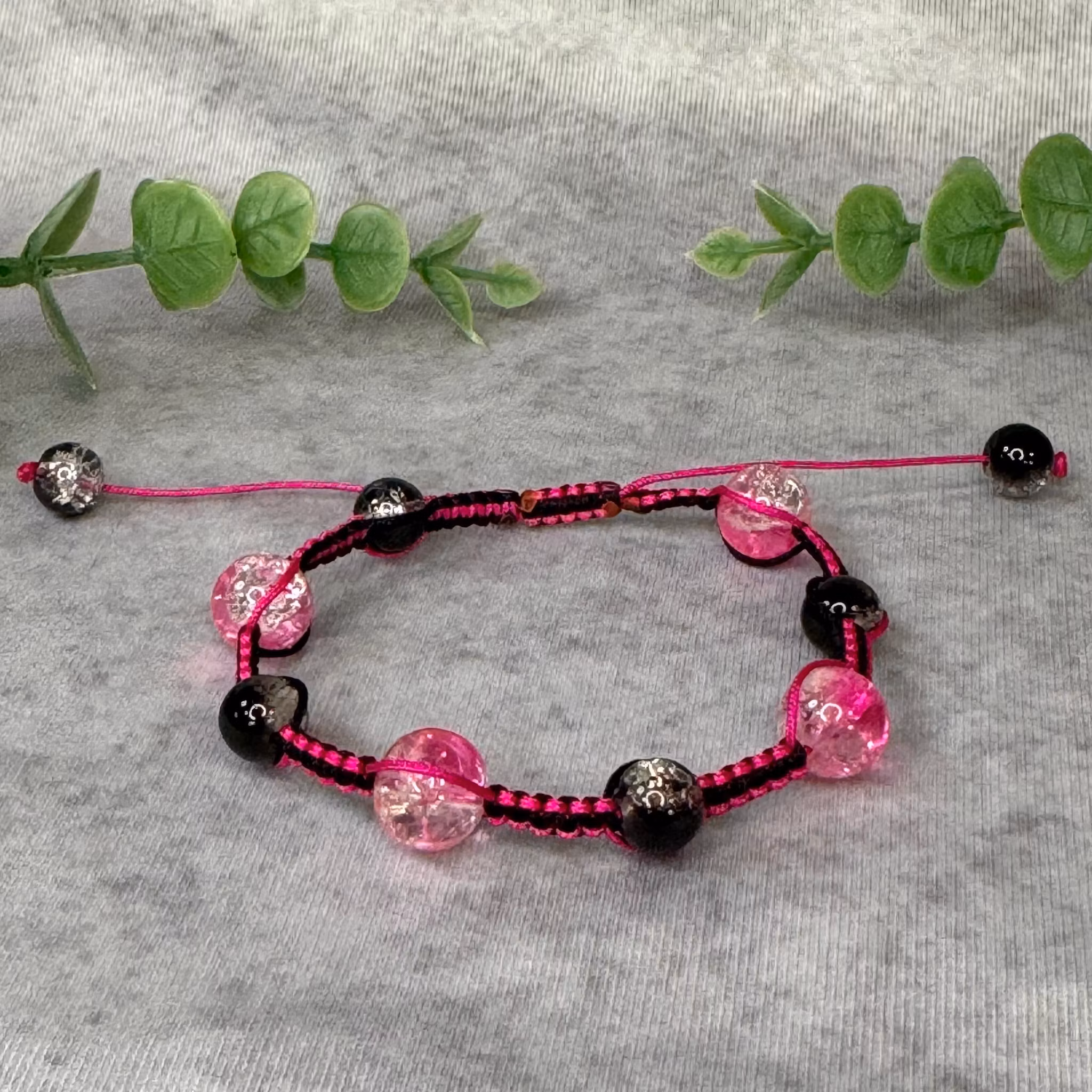 Dra uppmärksamhet till det eleganta och trendiga med vårt makraméarmband, noggrant handgjort med rosa och svarta pärlor.