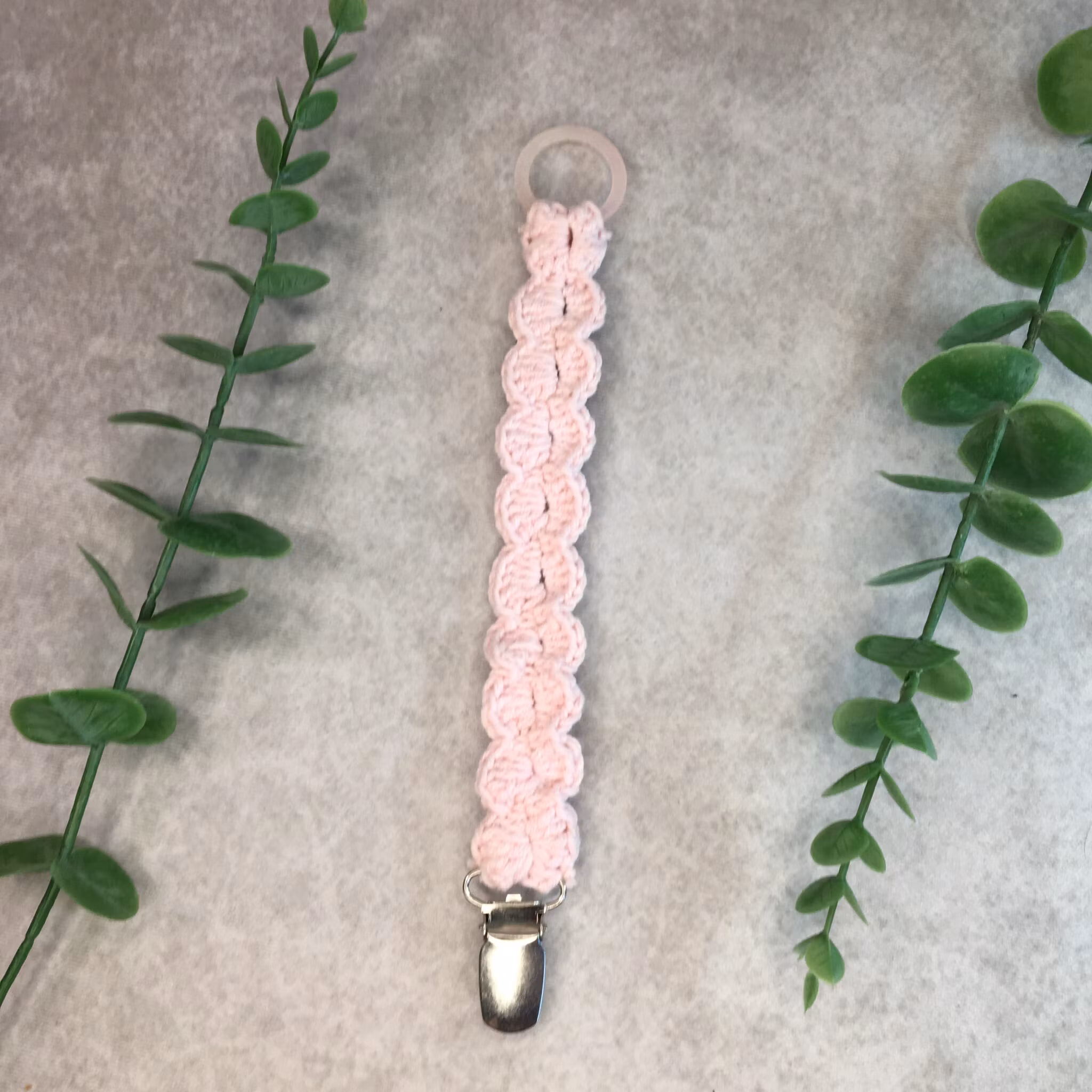 Dess handgjorda design ger varje napphållare en unik touth och den praktiska clipsen gör den enkel att fästa på barnets kläder eller vagn.
