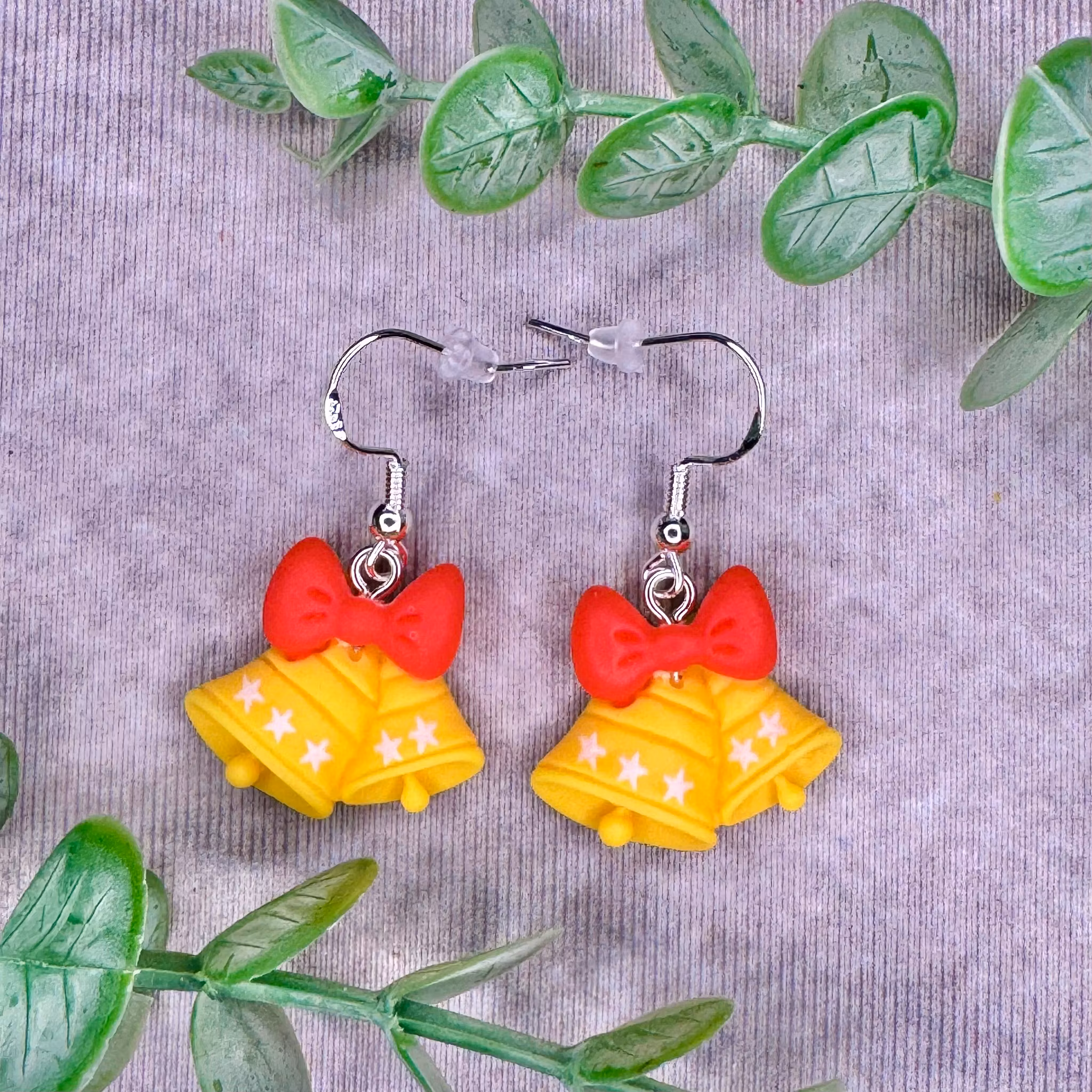 Glada bjällror i gult med röda rosetter – örhängen som klingar av julens magi.