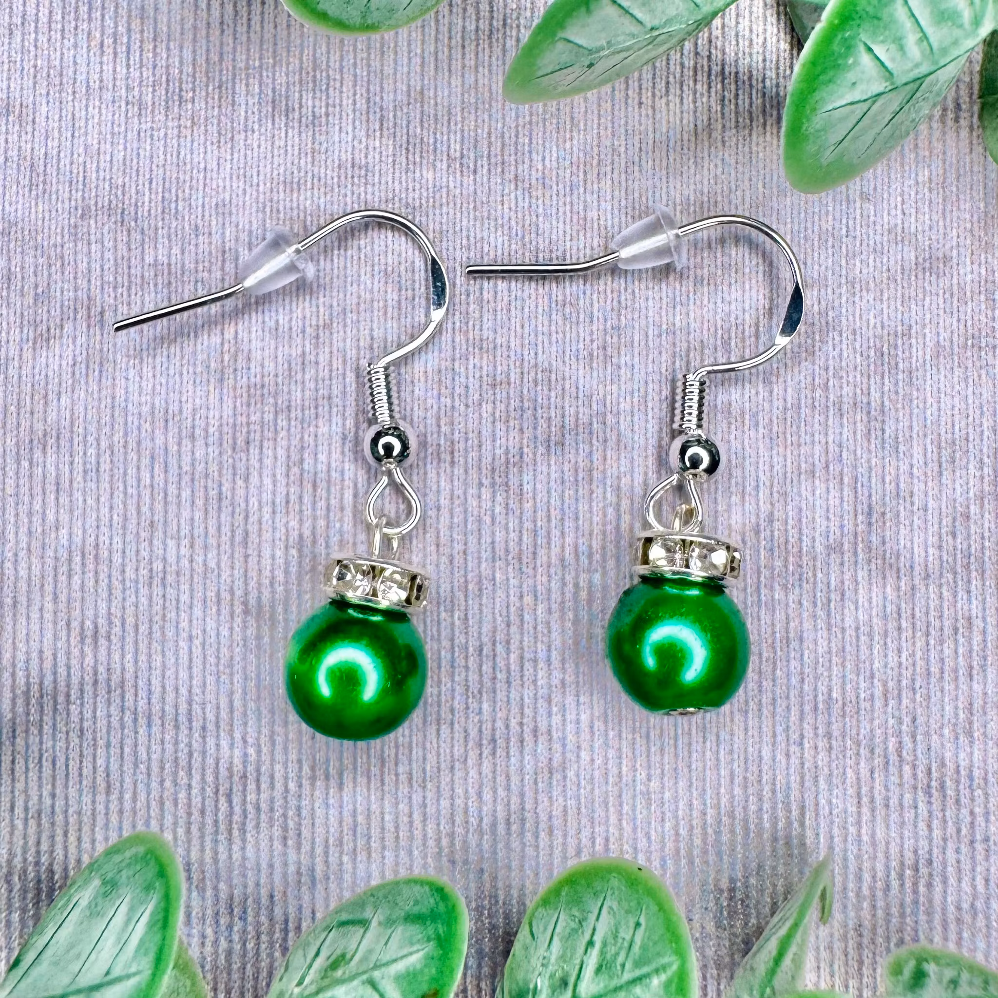 Gröna pärlörhängen formade som julkulor, inspirerade av klassiska juldekorationer.