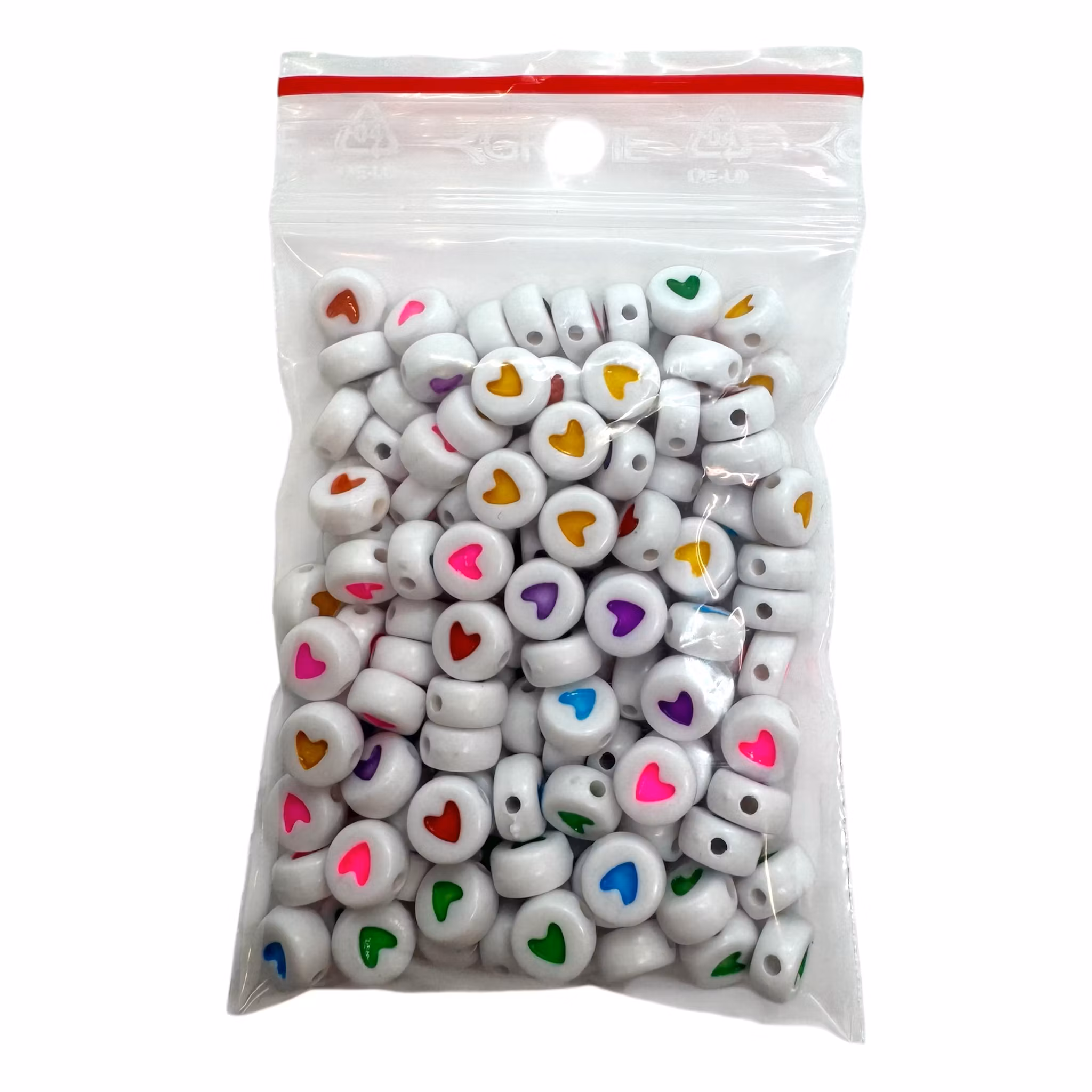 Pärlor med hjärtan i färgerna gul, rosa, röd, lila, blå och grön. I förpackningen får du minst 20 st av varje färg, plus några extra av vissa färger – totalt 130 pärlor, perfekt för färgglada och personliga armband.