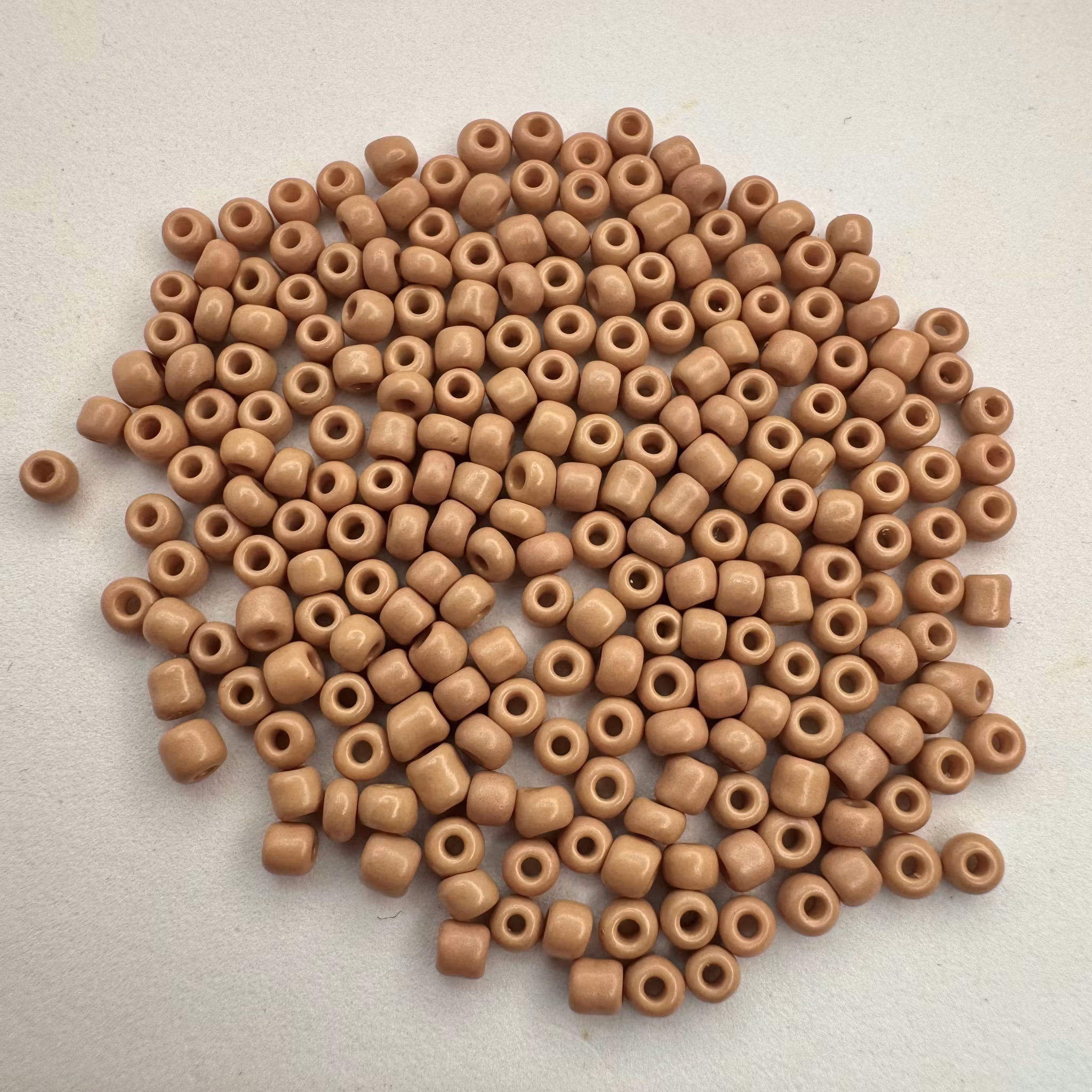 Små runda glaspärlor, något ojämna till formen, i en varm och naturlig färg.